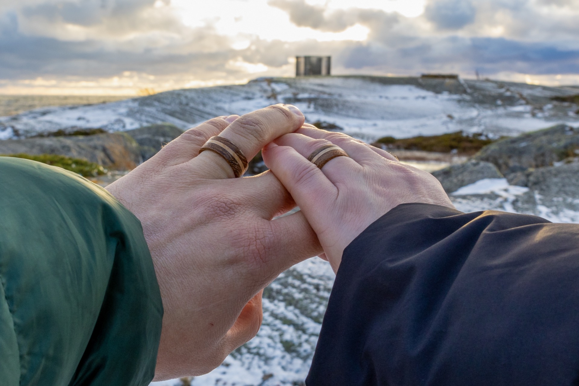 Kihlauduimme Utöllä marraskussa 2024. Markus oli valmistanut ensimmäiset sormukset tiikistä ja vaahterasta. Myöhemmin otimme käyttöömme kultasepän valmistamat sormukset.